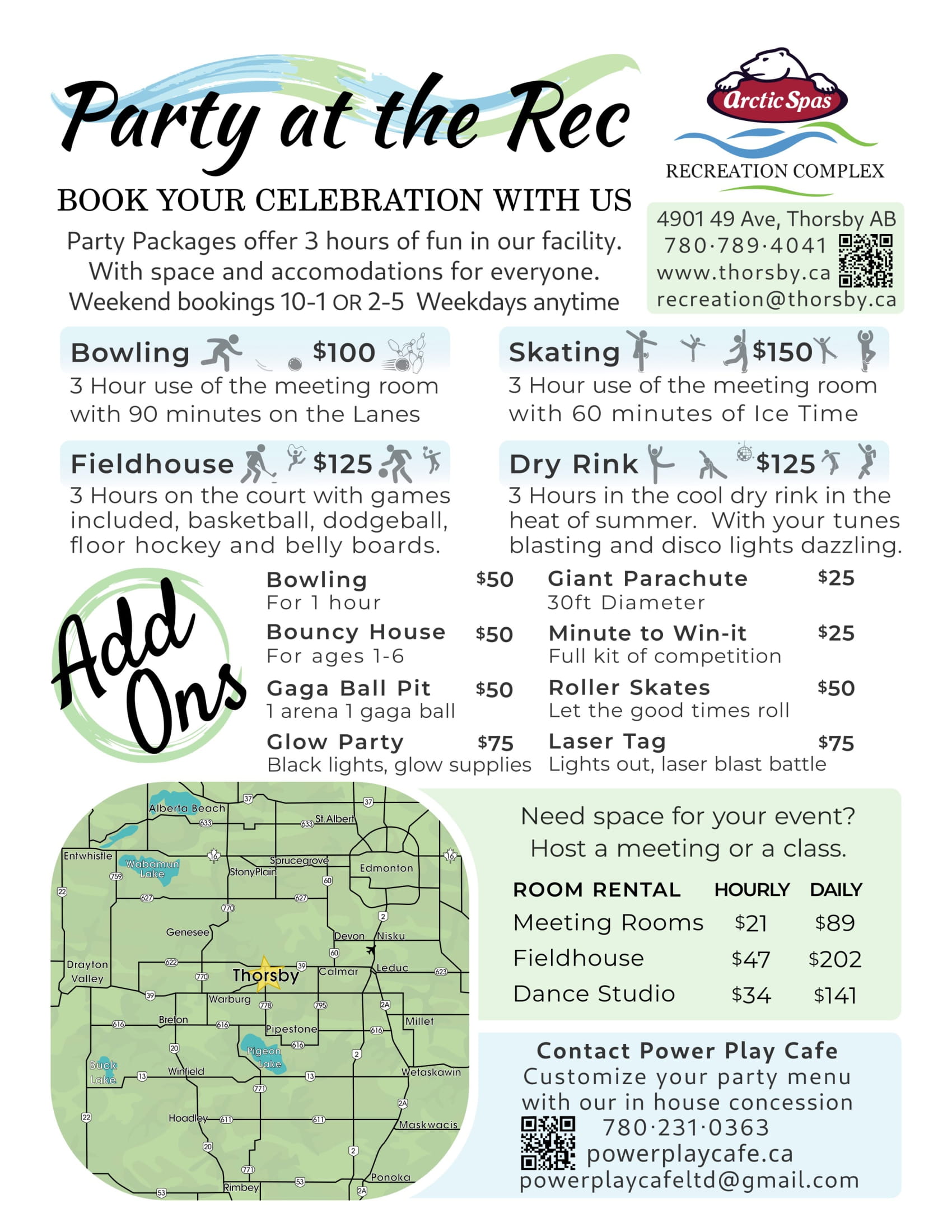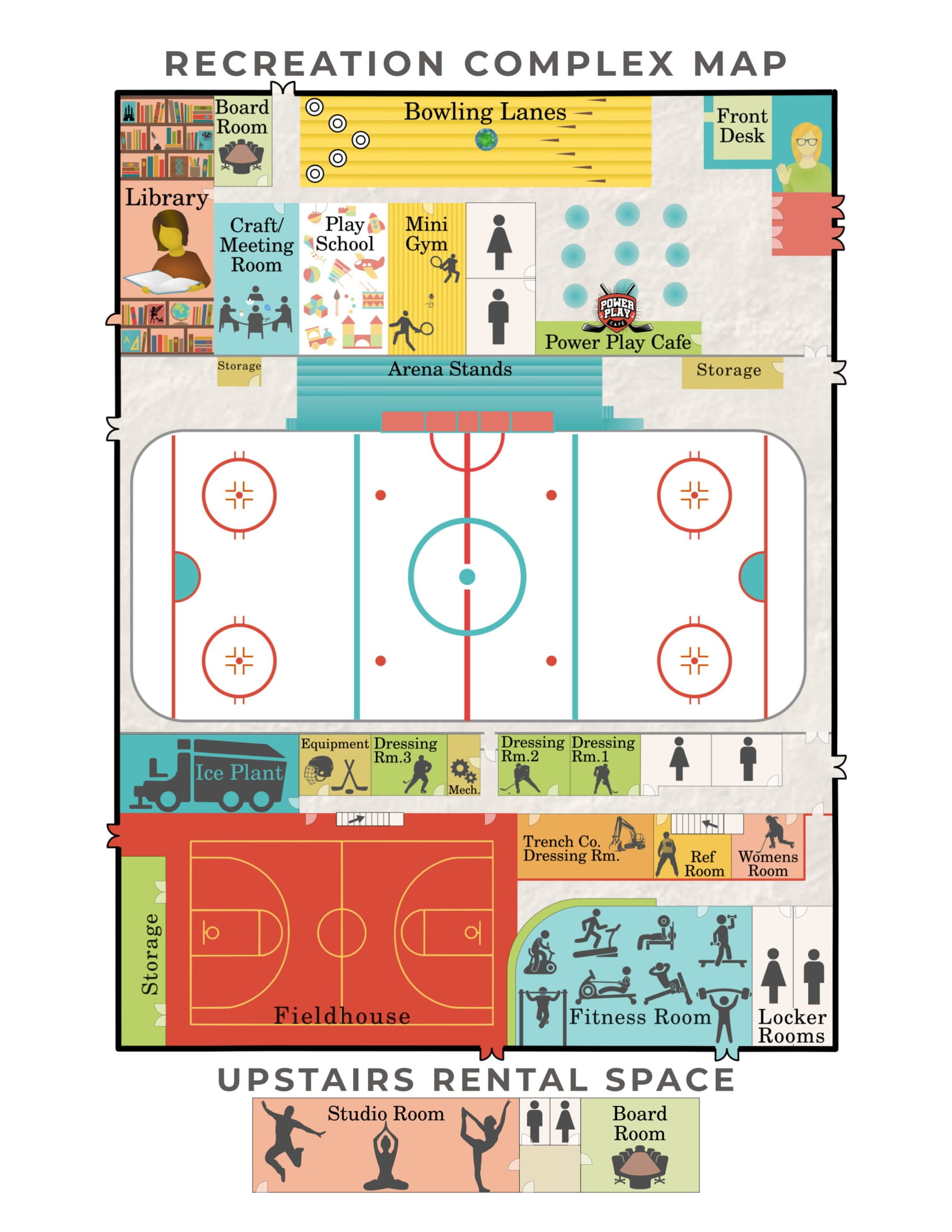 Everything under one roof - minor, shinny and adult hockey, public skating, multi-purpose field house, dance & yoga studio, league and youth bowling, racquetball, fitness facility, library, craft room, meeting rooms, baseball diamonds, and soccer fields.